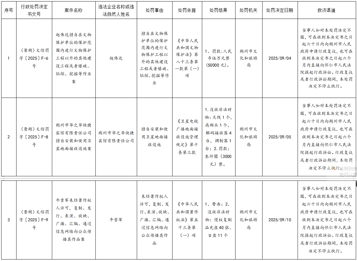 朔州市文化和旅游局行政处罚信息3条