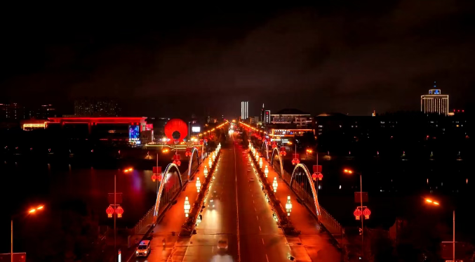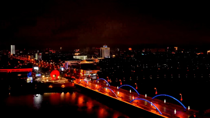 无人机缓缓升空,镜头穿过微凉的水汽,撞见满城霓虹——楼宇、车流、河面被晕出一片柔润的彩,倒比往日多了几分朦胧的诗意。往下望去,七里河大桥正卧在夜色里,车流是桥上流动的光河,车的灯光映在湿润的桥面上,又折进下方的河水里,和河畔的灯带缠在一起,让整条河都泛着细碎的光。云流动地很快,漏下几缕清浅的夜色,落在河面便成了摇晃的光斑。